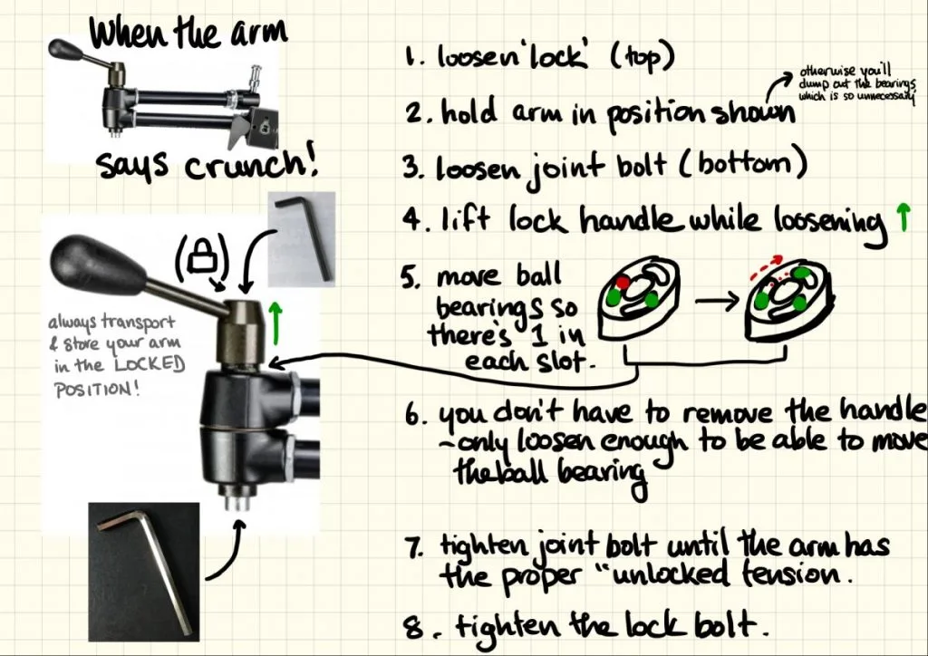Last time, we compared the difference between the lever type Manfrotto 143N and the knob type 244N. But at some point, your Manfrotto 143N Magic Arm (the lever type) might make a weird “crunch” sound and stop working – it won’t tighten OR loosen; you’re stuck somewhere in the middle.