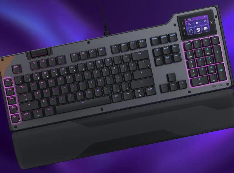 The Command KB7 is a Ten-Keyless (TKL) wired keyboard with media keys/volume knob, per-key RGB lights and a large color touchscreen with quick access to gaming and system information.