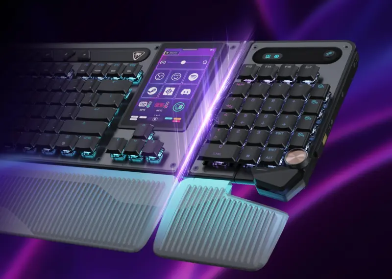 Titan low-profile mechanical switches actuate at just 1.2mm for fast, precise input, paired with premium double-shot PBT keycaps and additional textured WASD keys for enhanced grip and feel. Pre-lubed switches, tuned stabilizers, and true 8K polling deliver smooth, ultra-responsive performance, while five dedicated macro keys and a clickable volume barrel provide quick, intuitive control. A low-profile, aluminum-reinforced chassis with a detachable palm rest ensures lasting comfort and durability. Compatible with Windows 10/11 PCs. Available for pre-order now at $149.99/€159.99/£139.99, with global launch on May 21, 2026.