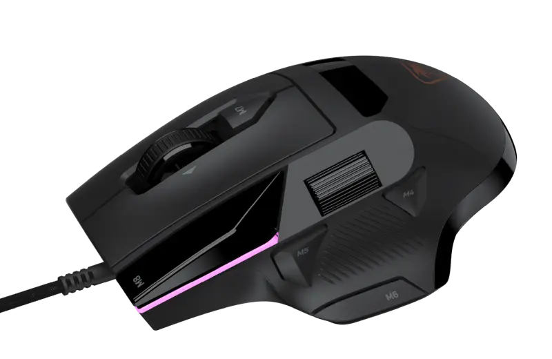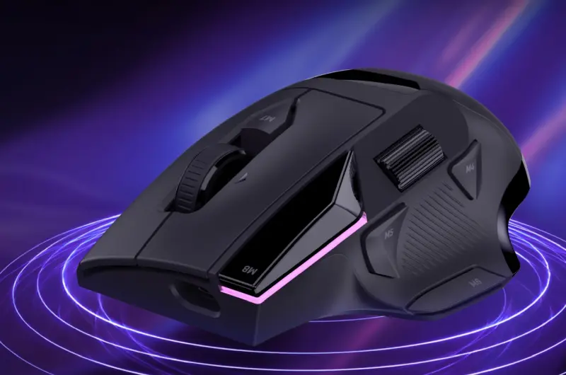 The Command MC7 wireless mouse has a long touchscreen located between the thumb and forefinger area that functions much like the Command keyboards. It uses the Owl Eye 30K DPI optical sensor, has 8K polling, latency of 0.125ms and uses the Titan optical switch.