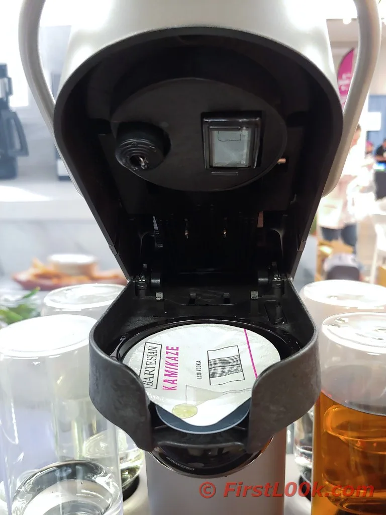 It needs your help of course. The initial setup requires a fill-up of alcohol and water (you’ll notice 4 empty reservoirs for them) and a supply of mix drink capsules.