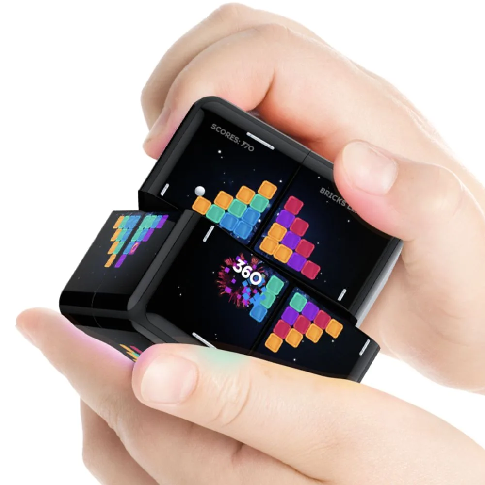 There are 8 independent modules with a CPU and 3 screens on each one. There’s also 8 audio channels and the cubes attach via magnetic connectors. After attachment, they automatically recognize each other for connected play. WowCube charges in the included dock and has a 5 hour battery life.